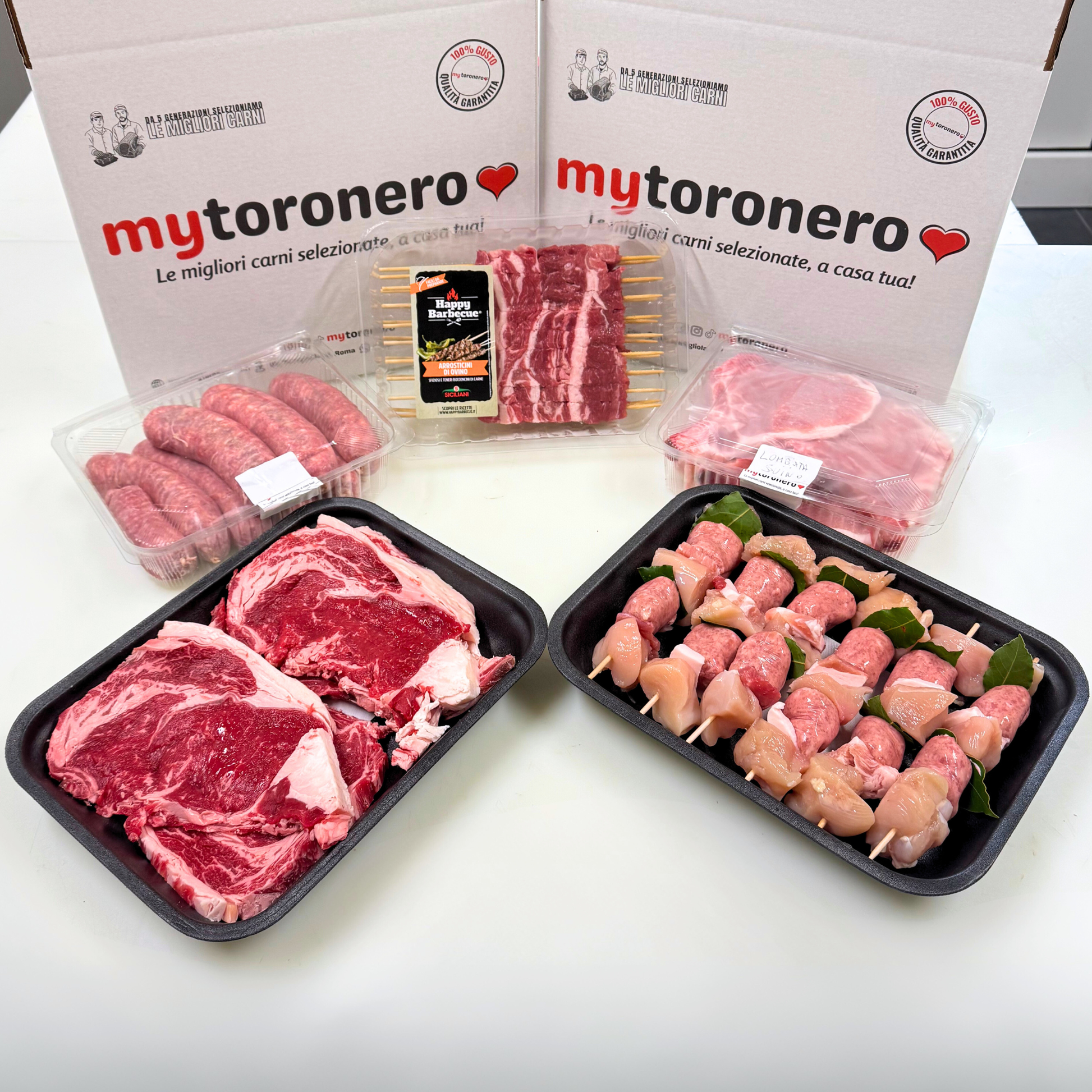 -1 Kg Entrecote di scottona -1 Kg Lombatine di suino -1 Kg Salsicce -1 Kg Spiedini misti pollo e suino -1 Confezione di arrosticini (almeno 400 gr)
