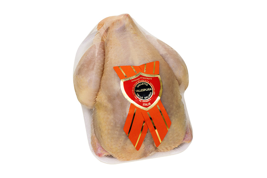 Galetto Vallespluga da 480-540 gr. Allevati a ridosso delle Alpi in un contesto di bassa densità animale possono razzolare a terra in ampi spazi. Sono nutriti con mangimi vegetali a base di granoturco, soia e frumento, con acqua e aria di montagna. L’elevato livello di biosicurezza permette di evitare l’uso di antibiotici.
